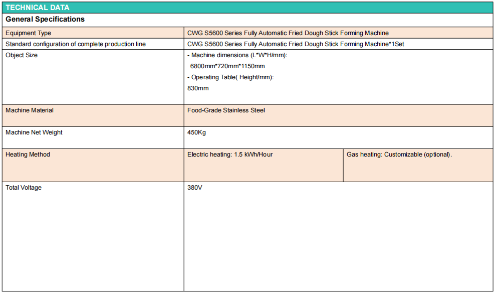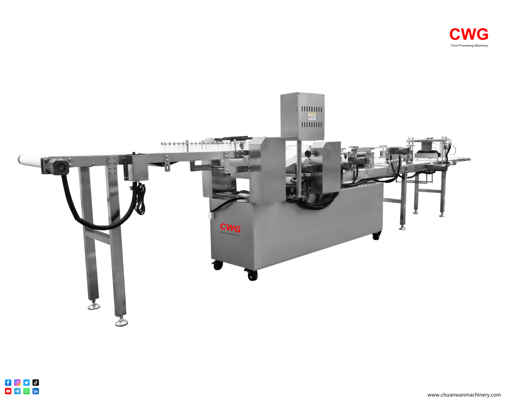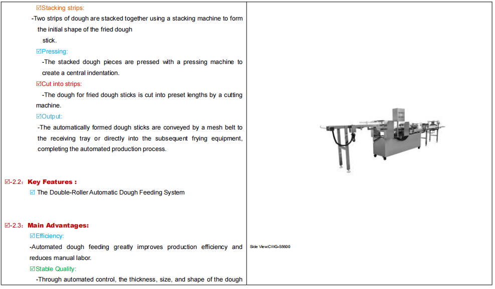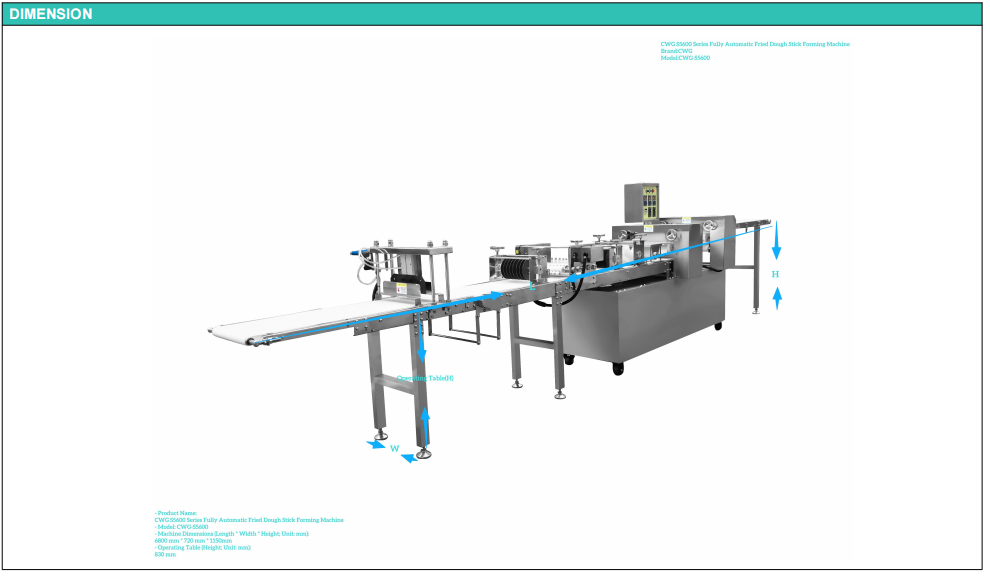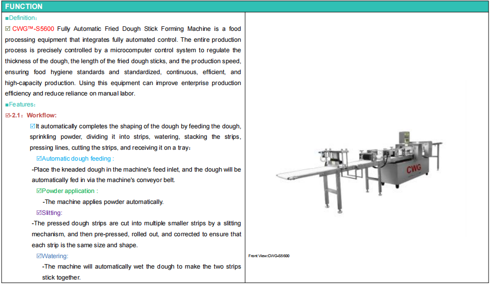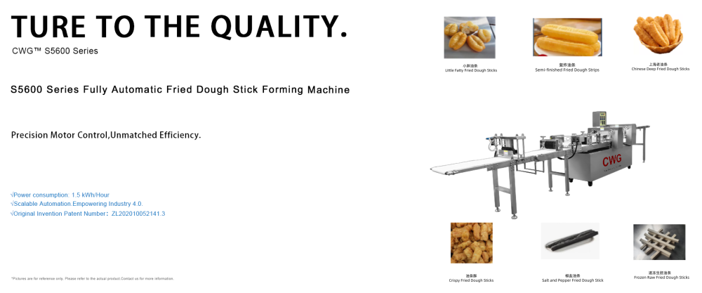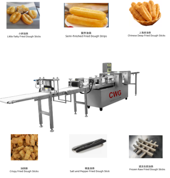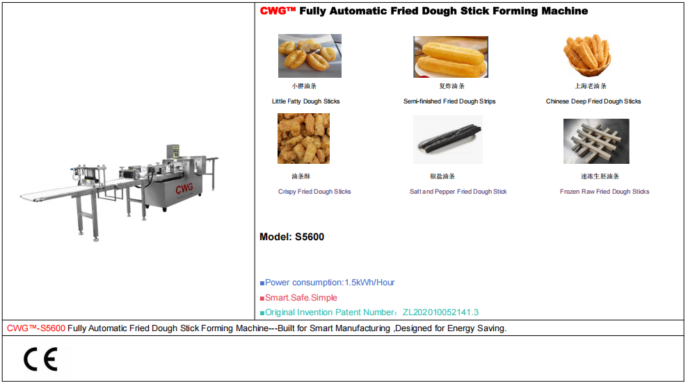 CWG™-S5600 Fully Automatic Fried Dough Stick Forming Machine is a food processing equipment that integrates fully automated control. The entire production process is precisely controlled by a microcomputer control system to regulate the thickness of the dough, the length of the fried dough sticks, and the production speed, ensuring food hygiene standards and standardized, continuous, efficient, and high-capacity production. Using this equipment can improve enterprise production efficiency and reduce reliance on manual labor