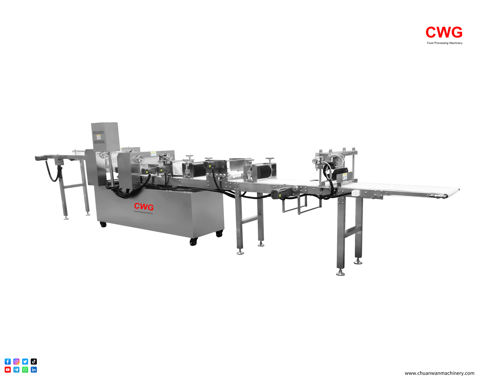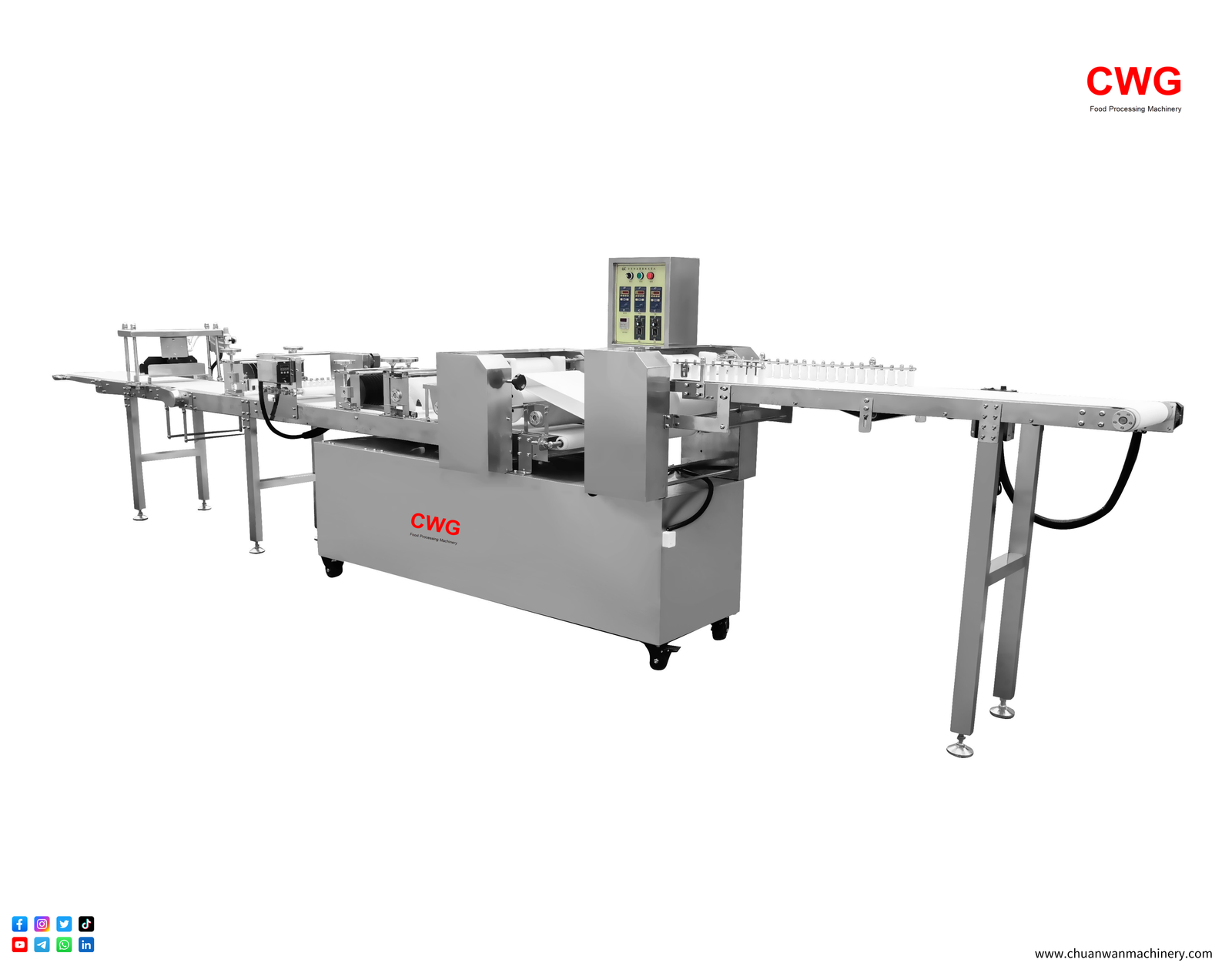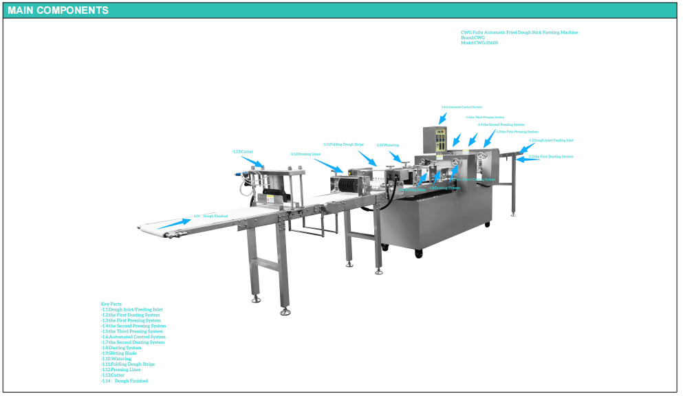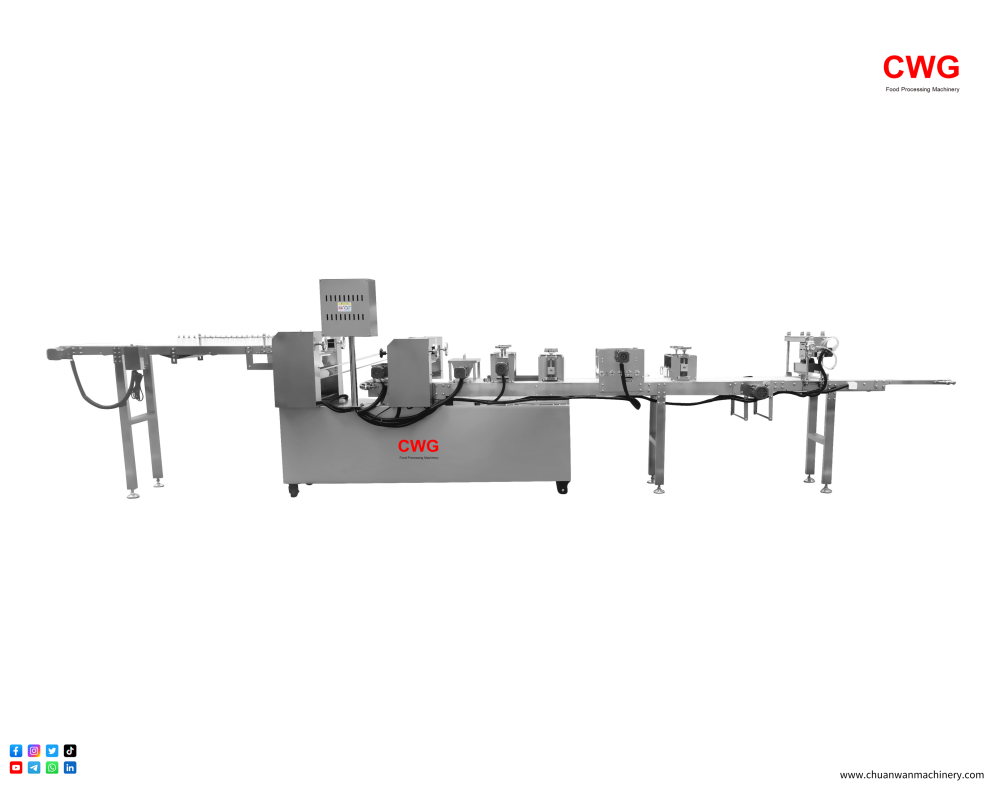 CWG™-S5600 Fully Automatic Fried Dough Stick Forming Machine is a food processing equipment that integrates fully automated control. The entire production process is precisely controlled by a microcomputer control system to regulate the thickness of the dough, the length of the fried dough sticks, and the production speed, ensuring food hygiene standards and standardized, continuous, efficient, and high-capacity production. Using this equipment can improve enterprise production efficiency and reduce reliance on manual labor