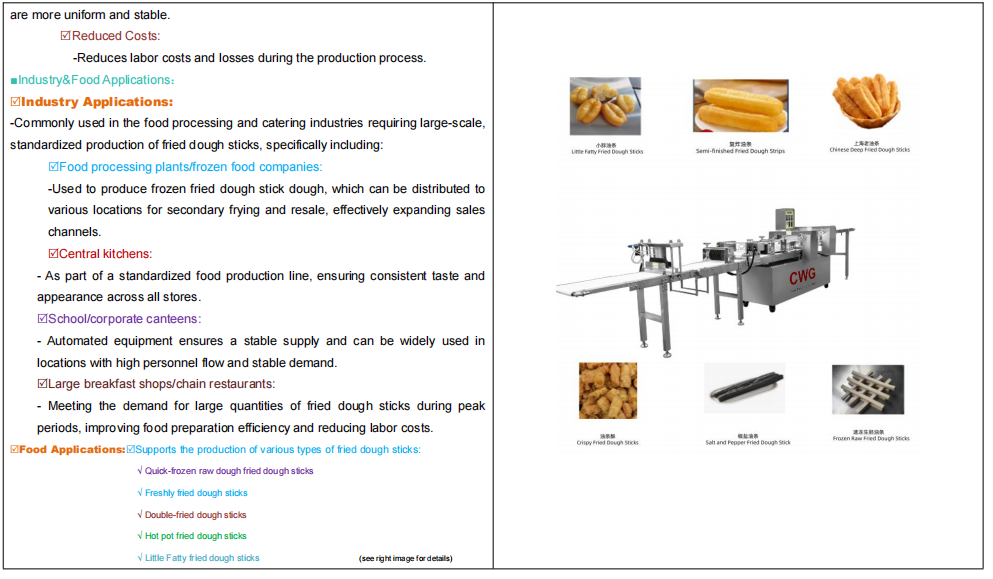 -Commonly used in the food processing and catering industries requiring large-scale, standardized production of fried dough sticks, specifically including: